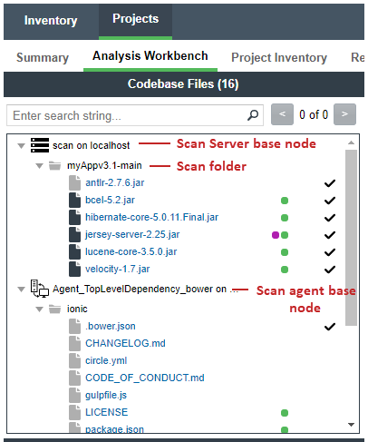 The Codebase Files pane in the Analysis Workbench lets you browse a codebase tree listing the project’s scanned files that you uploaded or synchronized to the Scan Server or that were scanned remotely by a Code Insight scan-agent plugin. The codebase tree provides the following: