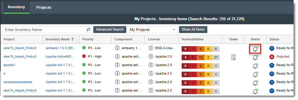 6. To view the open and closed alerts for a given inventory item associated with a given project, locate the item, and click the icon in the Alerts column.