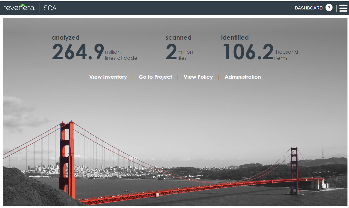 Login.The Code Insight dashboard is displayed. This dashboard shows statistics from the most recent codebase scans performed across all Code Insight projects and provides entry points to other parts of the Code Insight Web UI.